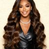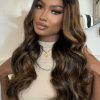 The UNice Bye-Bye Knots™ Brown Body Wave Glueless Wig Features Gorgeous Caramel Highlights And Soft Face-Framing Layers.