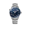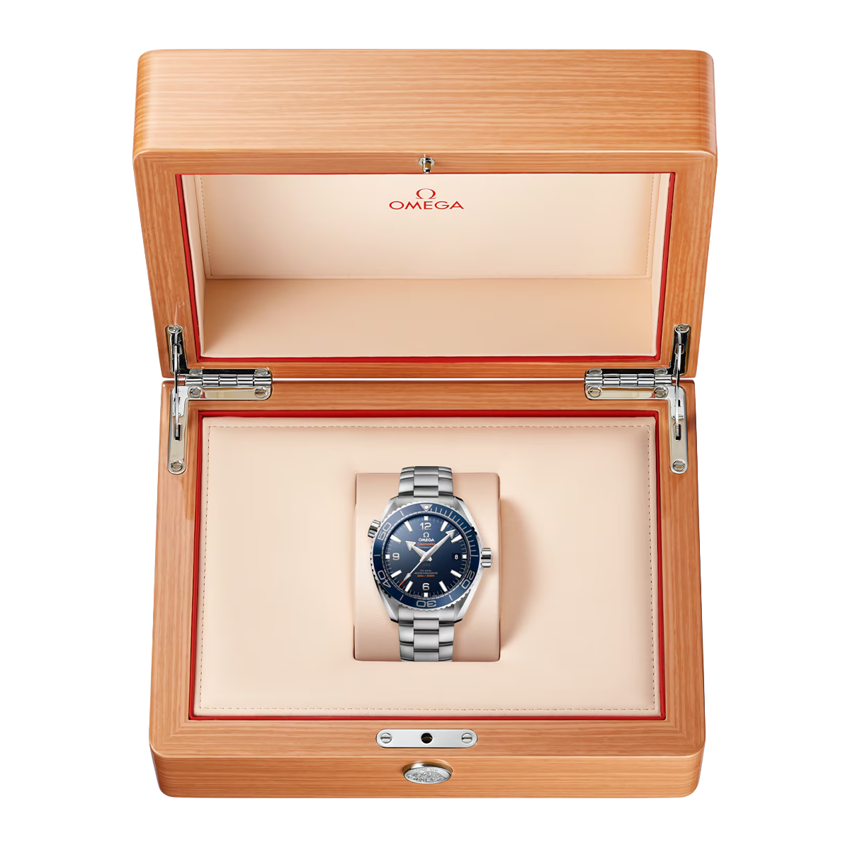 This model, with its scratch-resistant sapphire crystal, features a blue ceramic dial with Arabic numerals and a date window at the 3 o’clock position. The blue ceramic unidirectional bezel with OMEGA Liquidmetal™ diving scale is mounted on a 43.5 mm stainless steel case.