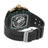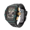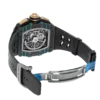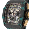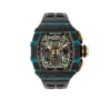 A bold statement, not for the faint of wrist. Limited to just 200 pieces globally, this Richard Mille pushes boundaries with its striking design. The iconic brand’s signature rubber strap cradles the watch, while the innovative Carbon TPT case features a captivating blend of turquoise and black Quartz TPT. This unique combination adds a fresh dimension to this enigmatic model and expands Richard Mille’s already vibrant color palette. Powered by the reliable RMAC1 caliber, the watch boasts a large date display at 12 o’clock, a month indicator at 4 o’clock, and an impressive 55-hour power reserve.