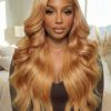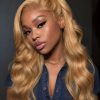 Honey Blonde 13×4 Lace Frontal Wig with Body Wave texture. Features a pre-cut lace and drawstring cap for a secure, beginner-friendly fit. Includes side-swept bangs for a face-framing effect.